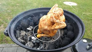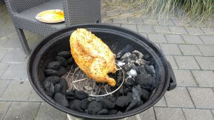 Ring aus Kohle um das Hähnchen aufschütten. Bei 180°C ca. 45 Minuten grillen.